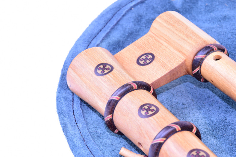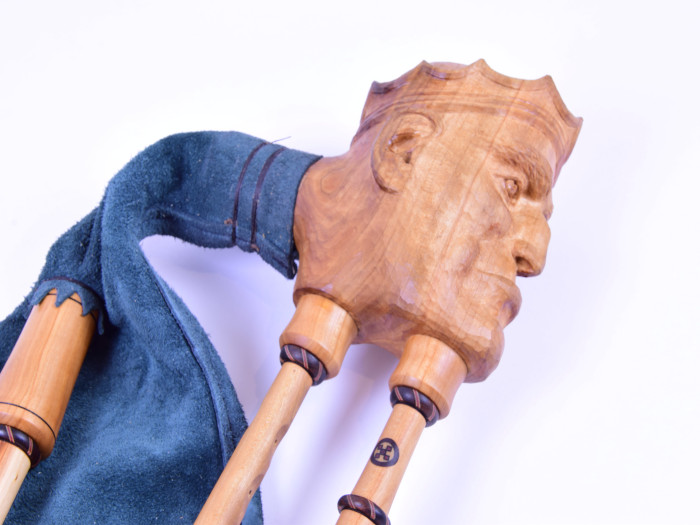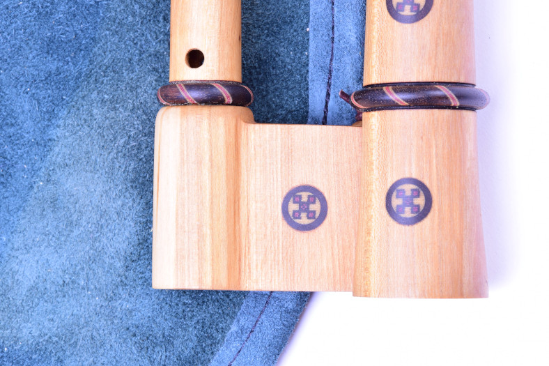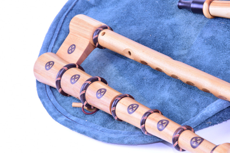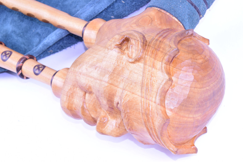 The royal bagpipes have a short drone led parallel to the chanter and the two pipes come from a stock in the shape of a royal head.