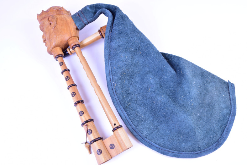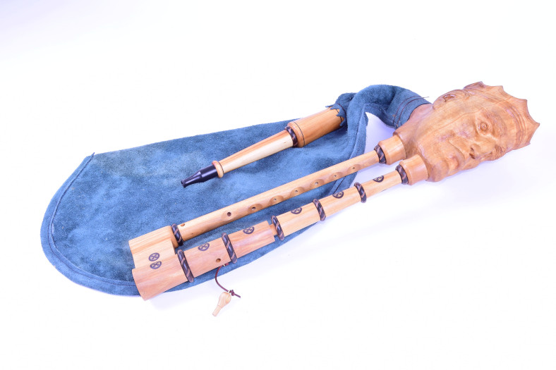 The royal bagpipes have a short drone led parallel to the chanter and the two pipes come from a stock in the shape of a royal head.